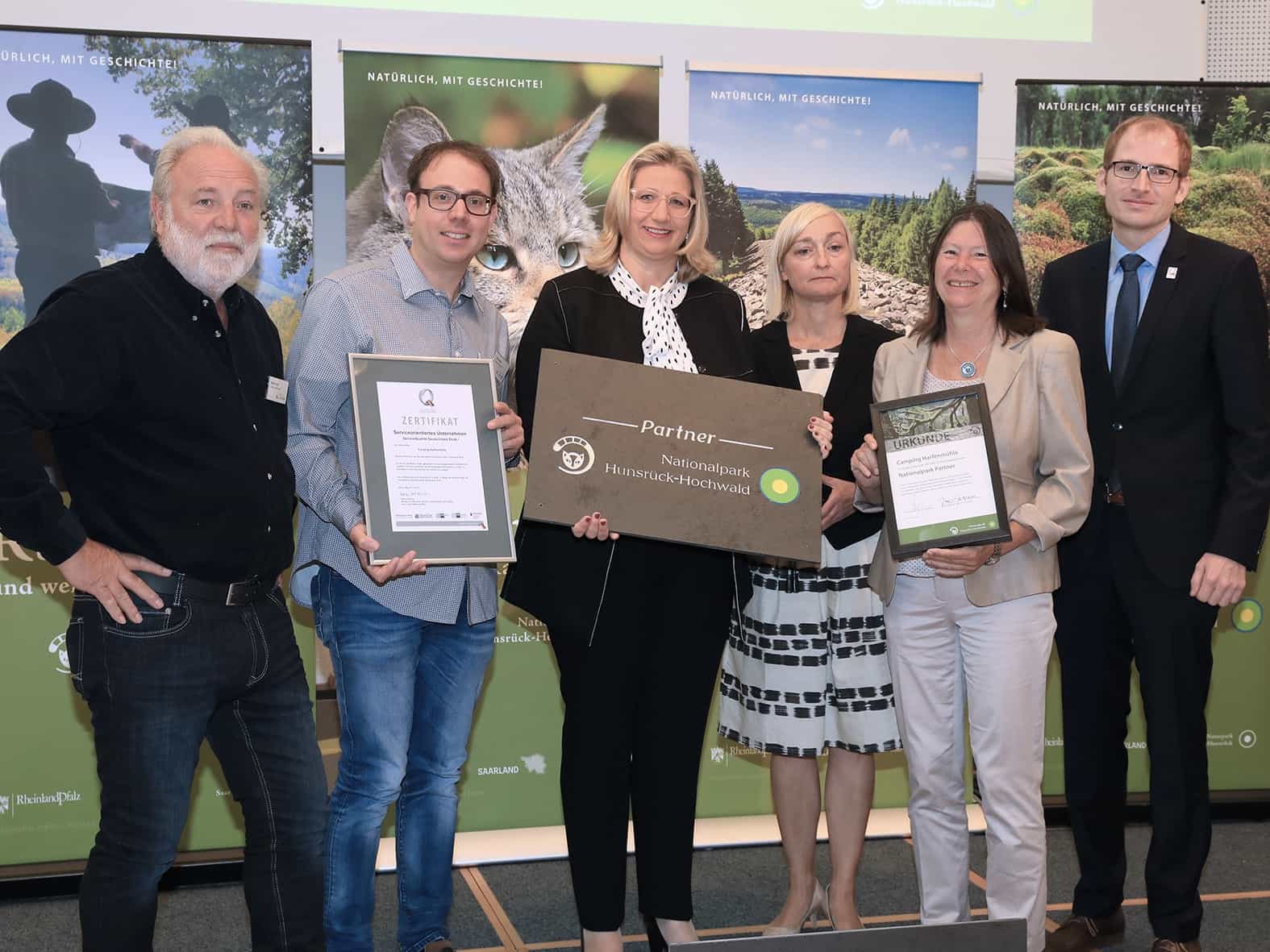 Im Beisein von Frau Staatsministerin Ulrike Höfken, Ministerium für Umwelt, Energie, Ernährung und Forsten Rheinland-Pfalz und Frau Staatsministerin Anke Rehlinger, Ministerium für Wirtschaft, Arbeit, Energie und Verkehr Saarland erhielten die Betriebe ihre Urkunde. Fortan dürfen unter anderem wir mit dem Titel „Partner des Nationalparks Hunsrück-Hochwald" werben.